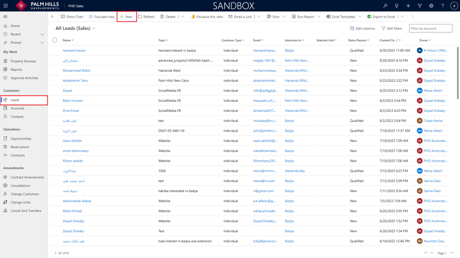 When you navigate to 'Leads', you can view all leads with interested properties. Click on the 'New' button to create a new lead.