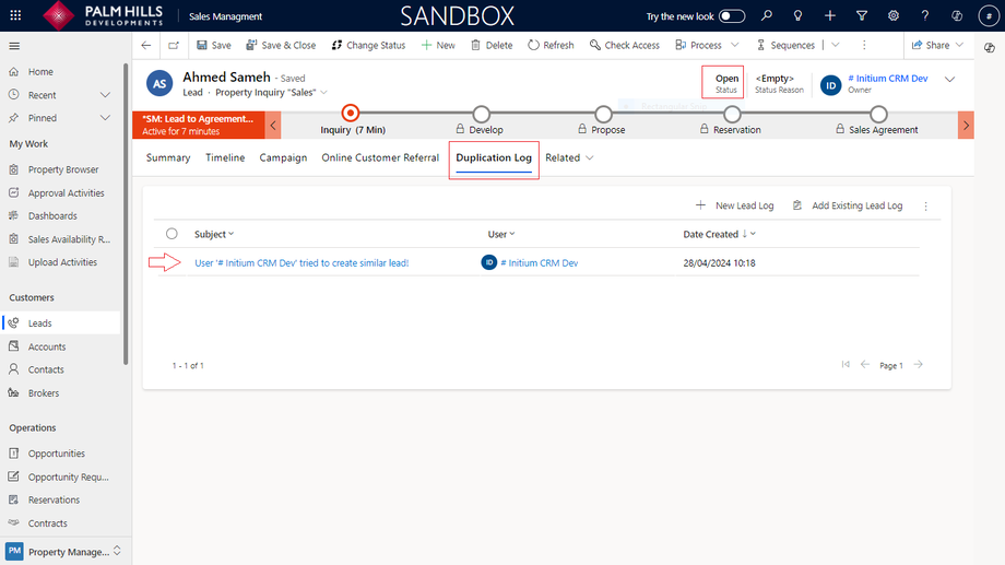 Upon returning to the original open lead and navigate the "Duplication Log", you'll discover a record indicating that a user attempted to create a lead with the same phone number for this lead.
