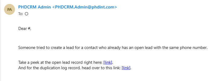Finally, an email is sent to the specific PHD department, notifying them that someone attempted to create a lead for a contact who already has an open lead with the same phone number.