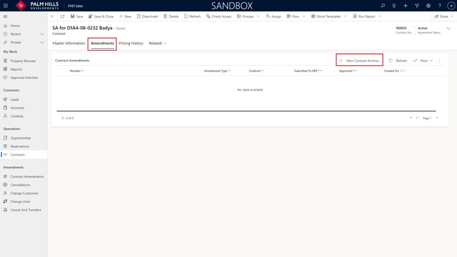 In a contract that has already been created, navigate to the 'Amendments' section and click on the 'New Contract Amendment' button.