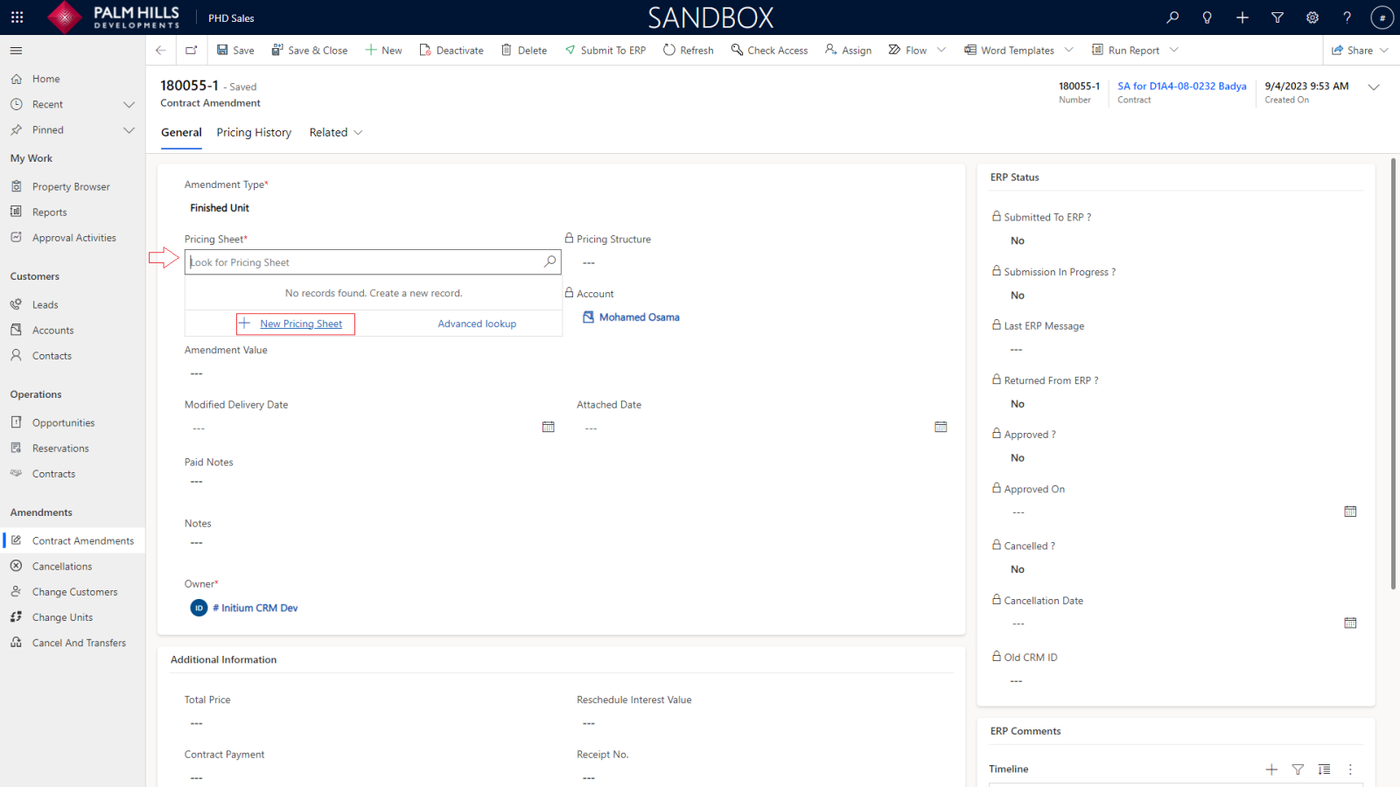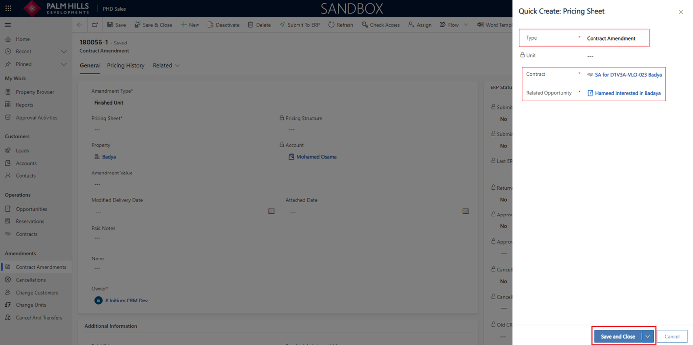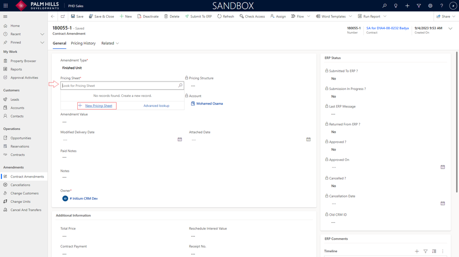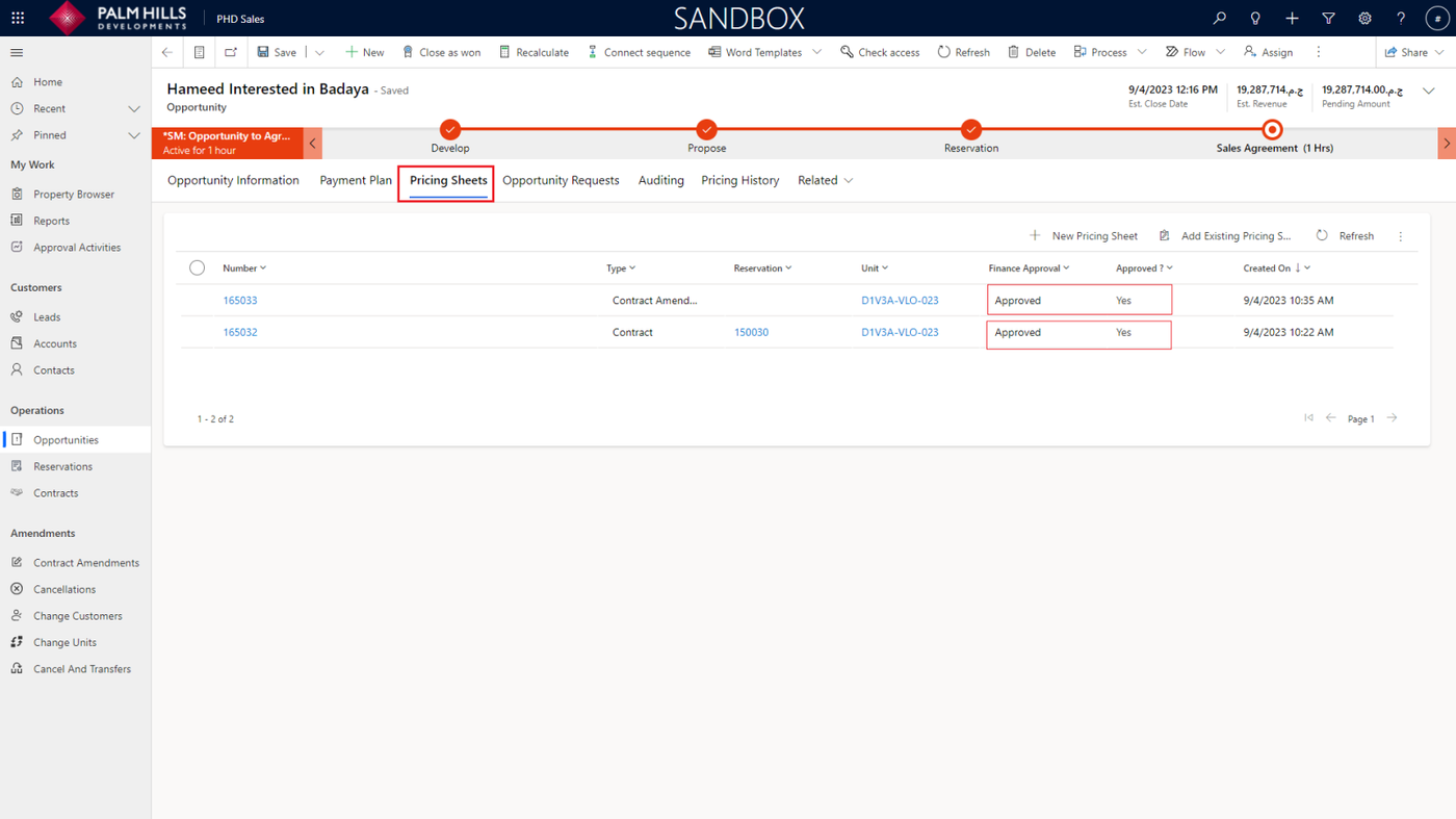 If you return to the opportunity and navigate to the 'Pricing Sheet' section, you will find the contract that was created before, as well as the contract amendment with approval from finance and ERP.