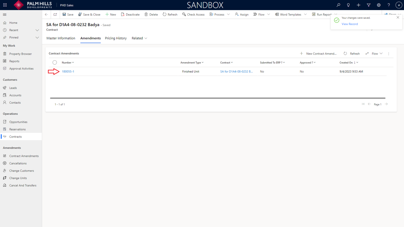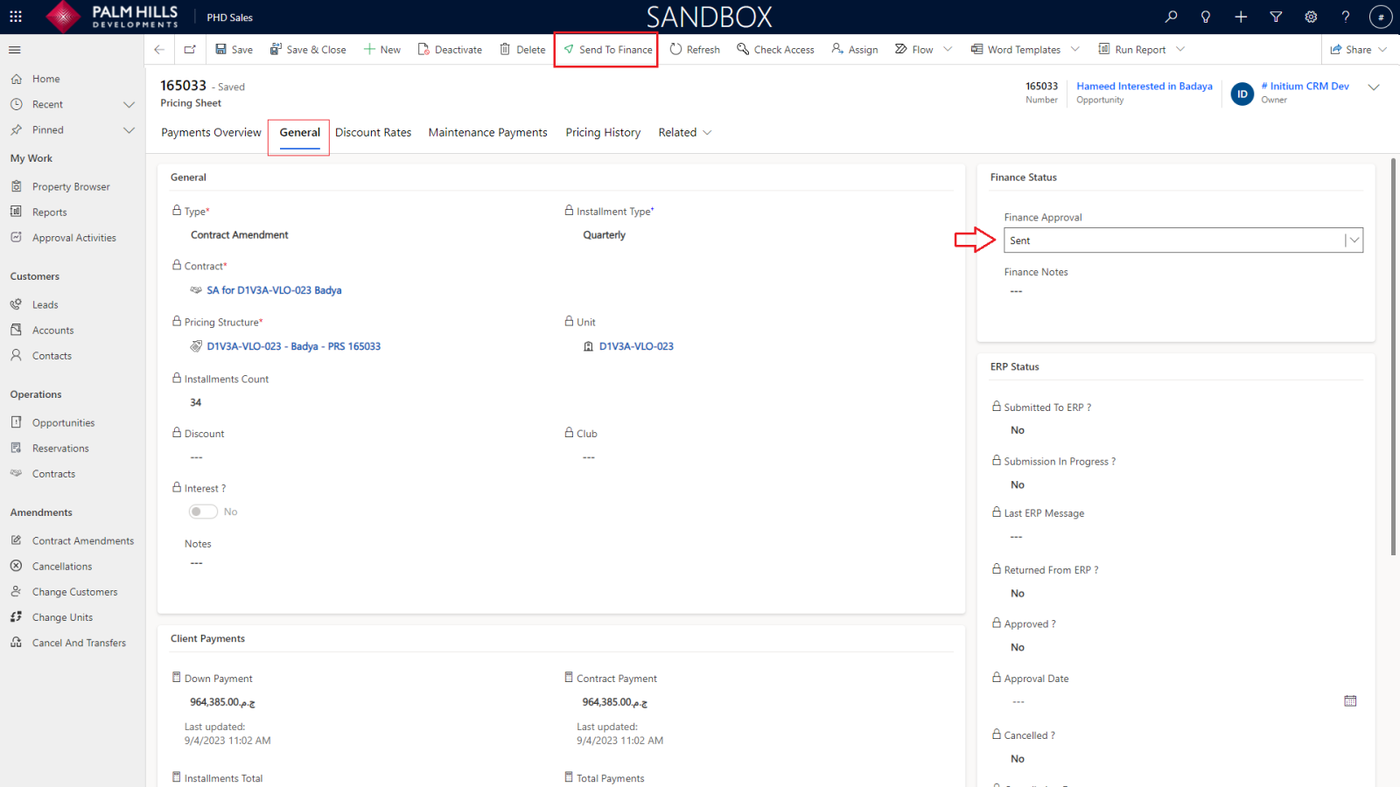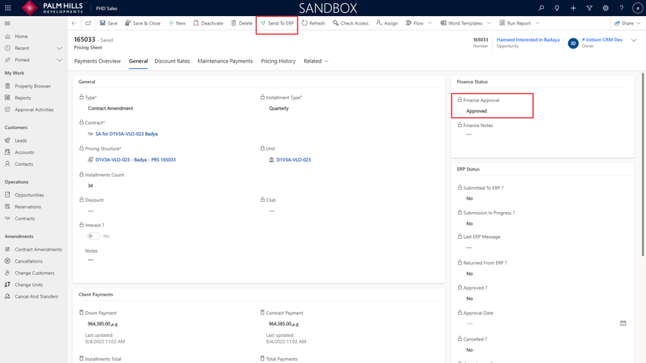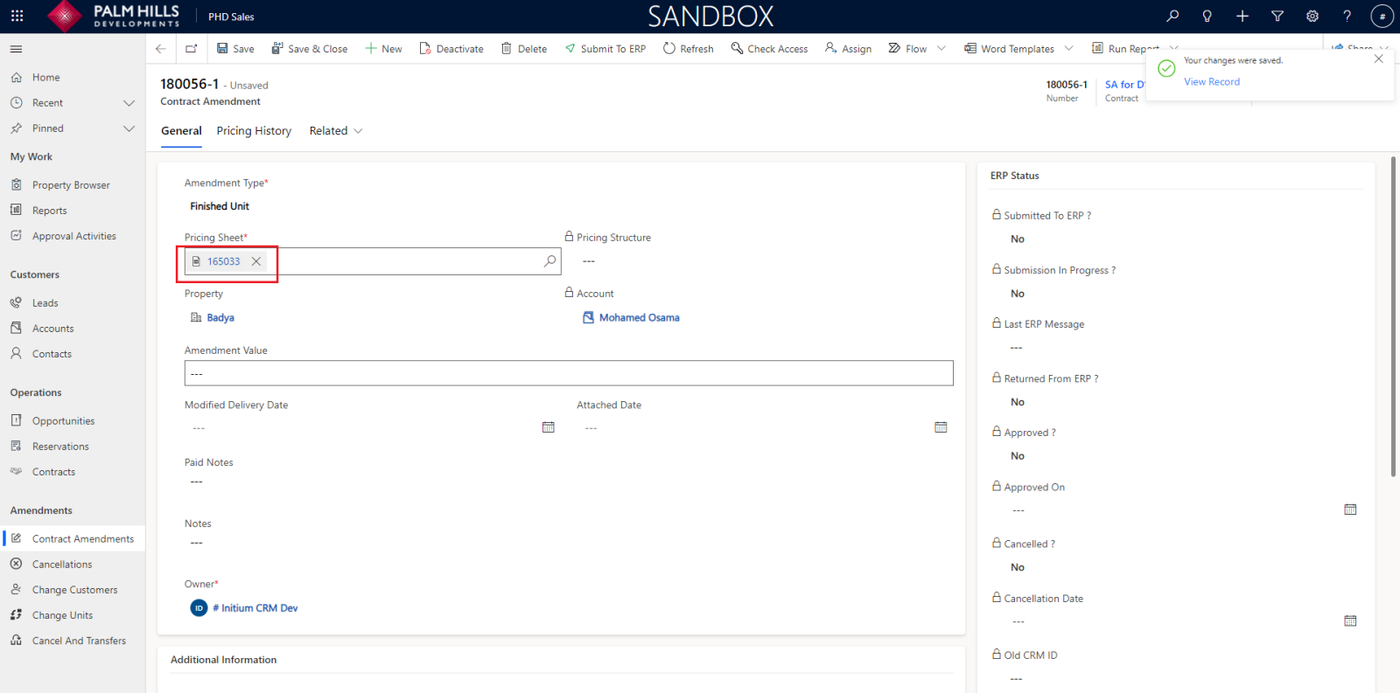If you return to the opportunity and navigate to the 'Pricing Sheet' section, you will find the contract that was created before, as well as the contract amendment with approval from finance and ERP.