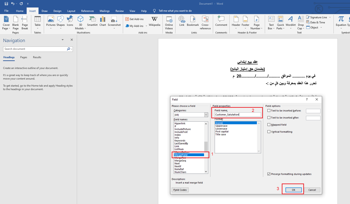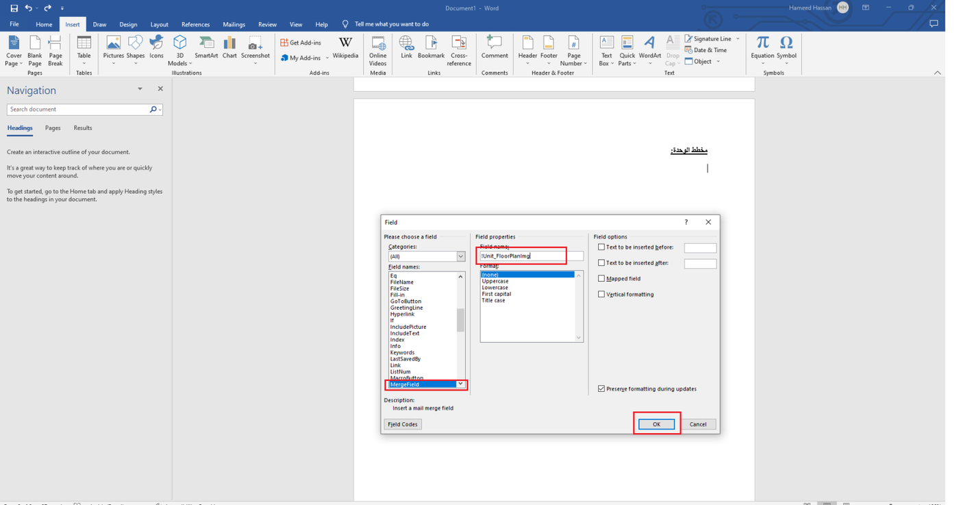 - Select the Field name 'Merge Field.'