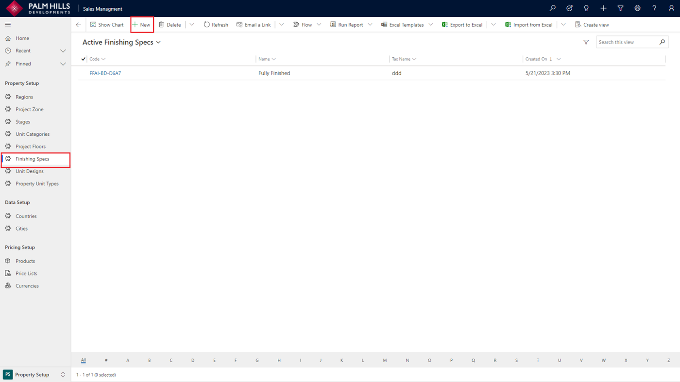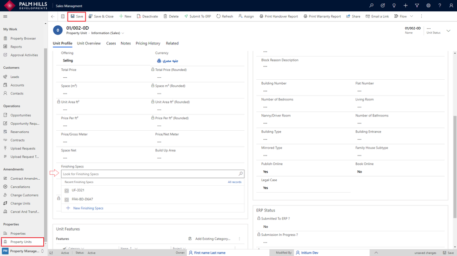 To update the unit design for a specific unit, navigate to the 'Unit' section, select the unit, and in the 'Finishing Specs' field, choose the previously created finishing specs, as shown below.