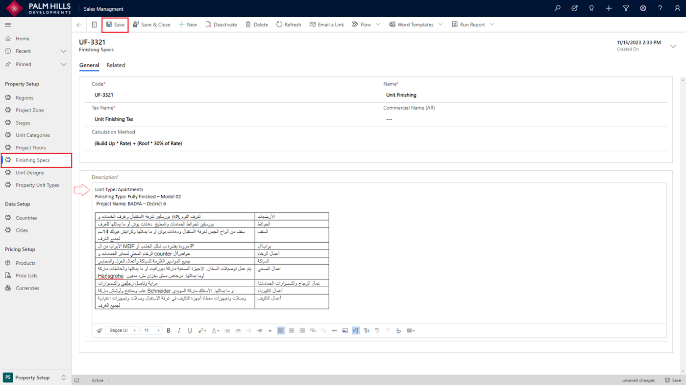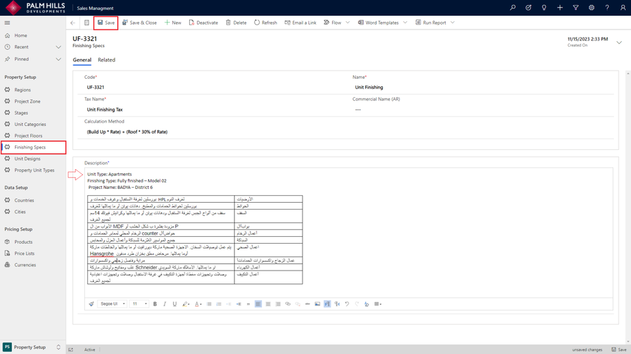Complete all required data fields, and in the description, add finishing specs details with appropriate style and formatting. Finally, click the 'Save' button.