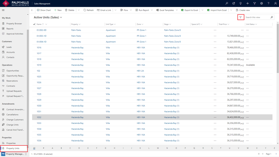 To perform a bulk update for a collection of units with a specific finishing specs, go to the 'Unit' section and utilize the units filter from the 'Filter' button.