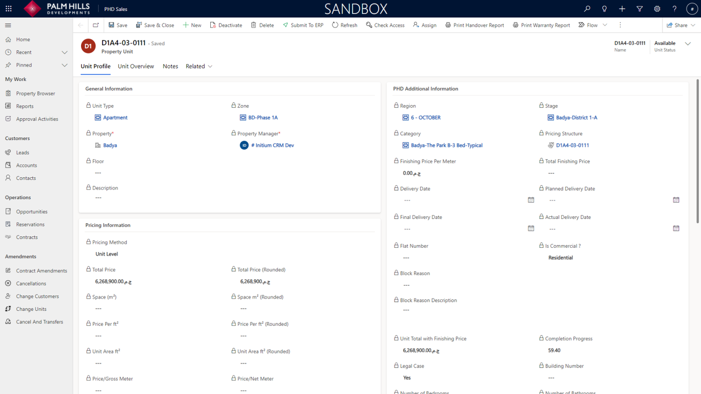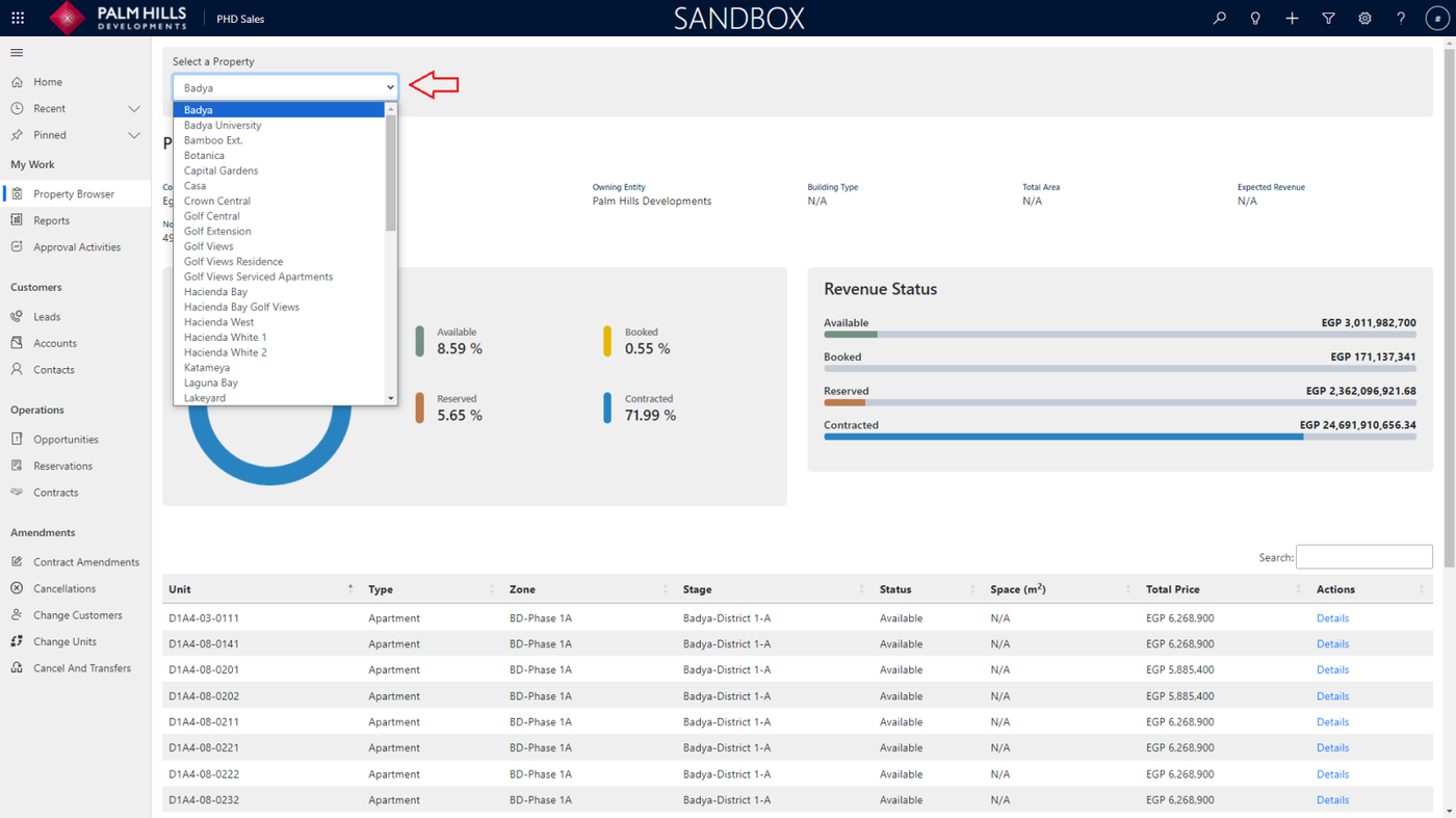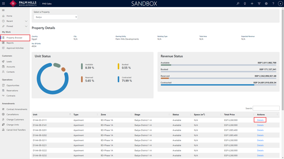 As shown in the figure, you can view charts representing the percentages of Available, Booked, Reserved, and Contracted units. Additionally, in the table, you can see available units related to the property, such as Badya. Clicking on 'Details' allows you to navigate to more detailed information about the unit.