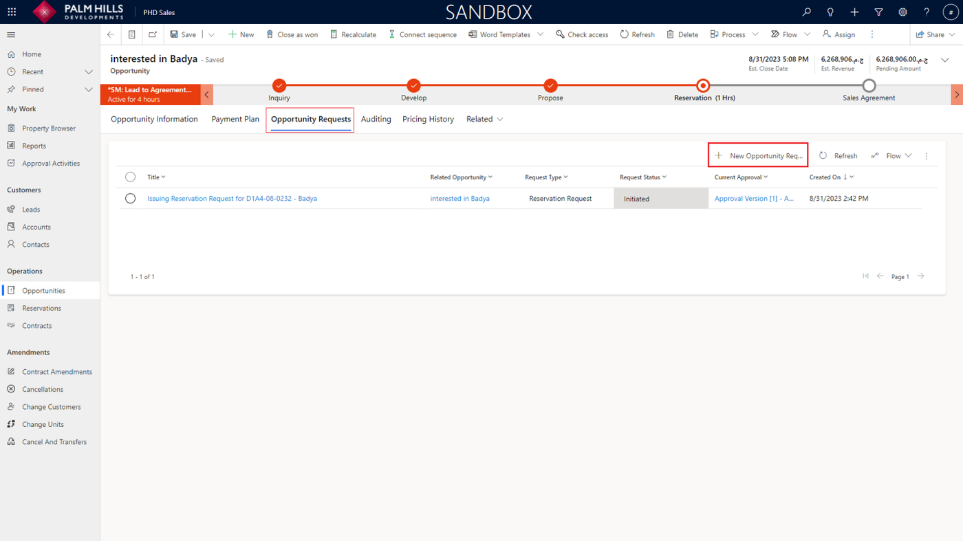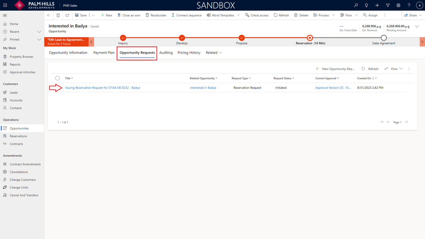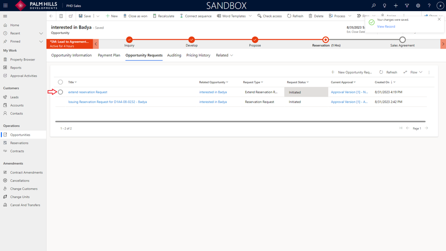 Once you click on 'Issuing Reservation', a new reservation request will be generated and sent for approval. To check the reservation request, navigate to the 'Opportunity Requests' tab.