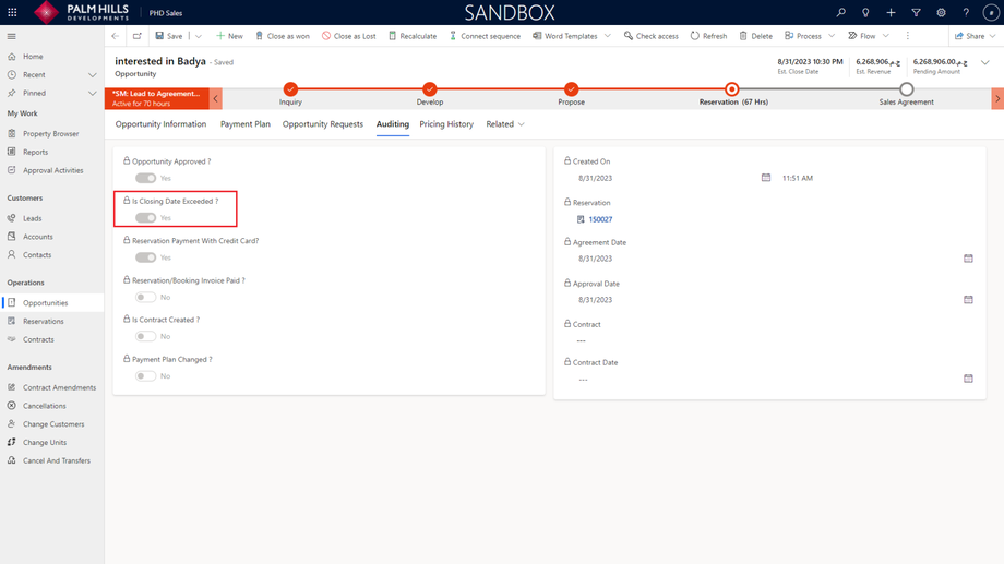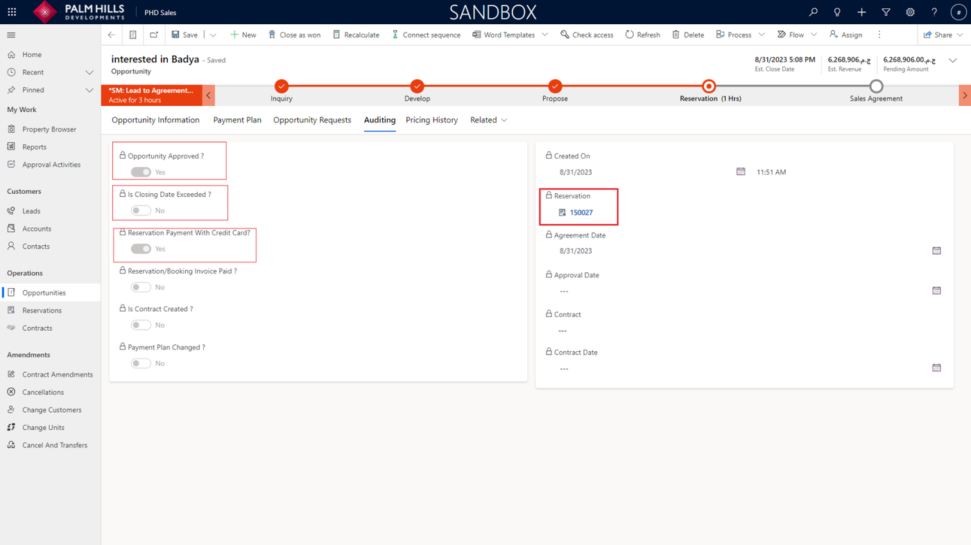When you go to Auditing, you will find metadata about the opportunity status, such as whether the opportunity is approved, if the closing date is exceeded, and if the payment was made with a credit card. Additionally, you can find the reservation record as shown below.