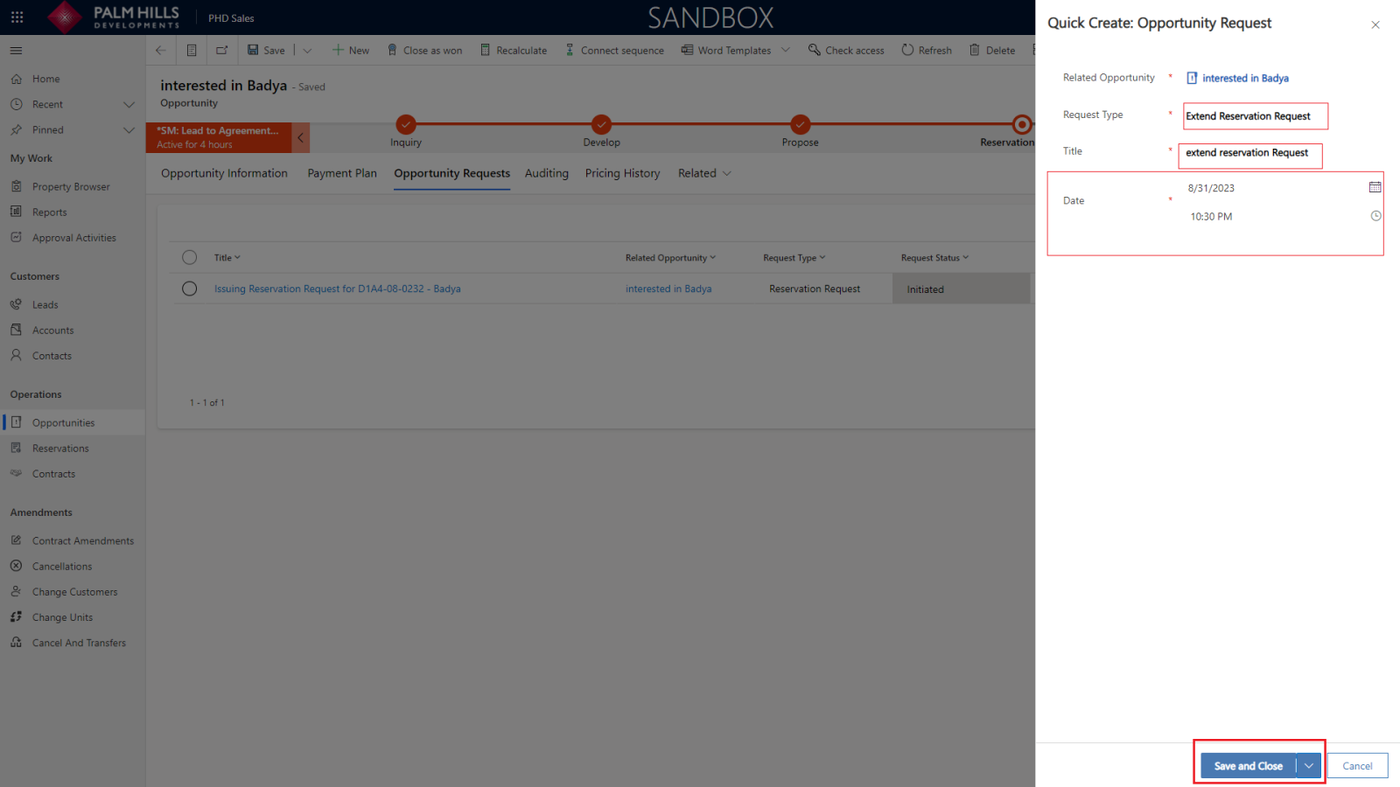 In this form, you need to fill in information about the opportunity request, such as request type, title, and the new estimated date and time. Then, click on the 'Save and Close' button.