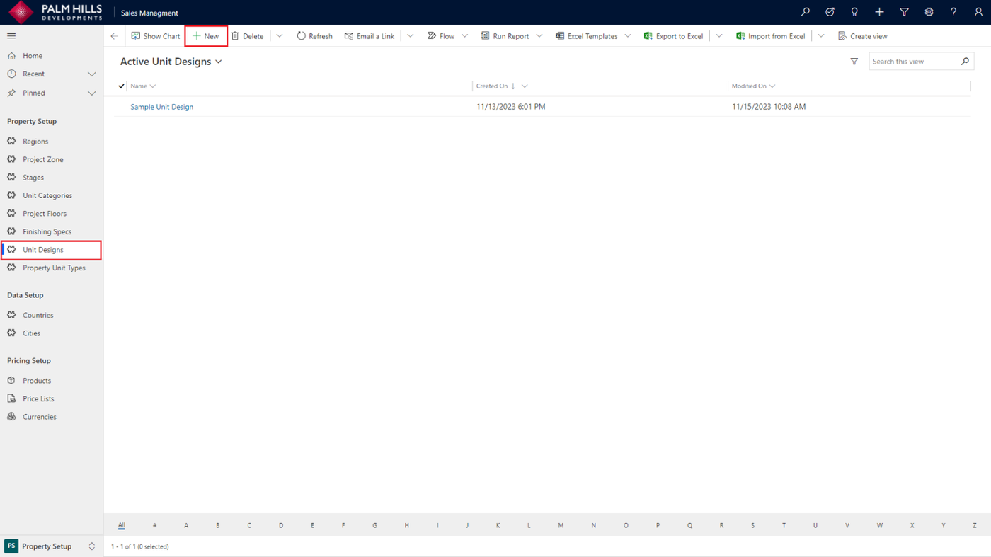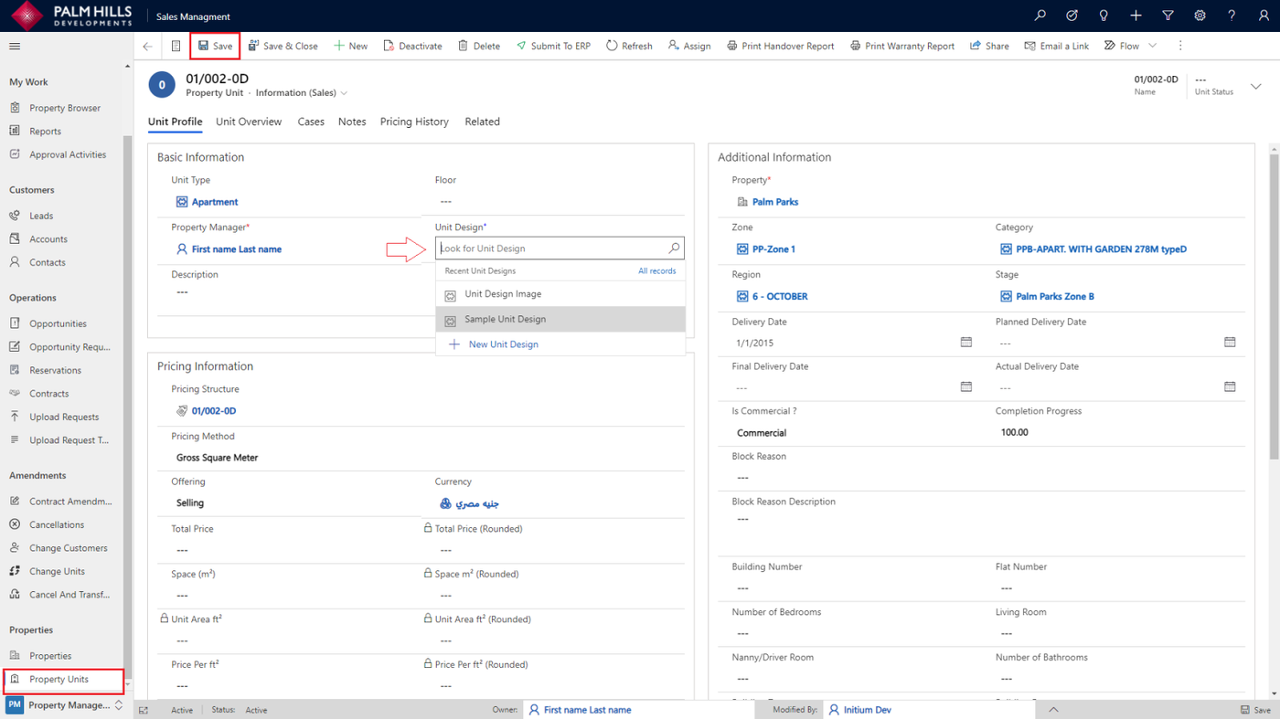 To update the unit design for a specific unit, navigate to the 'Unit' section, select the unit, and in the 'Unit Design' field, choose the previously created unit design, as shown below.