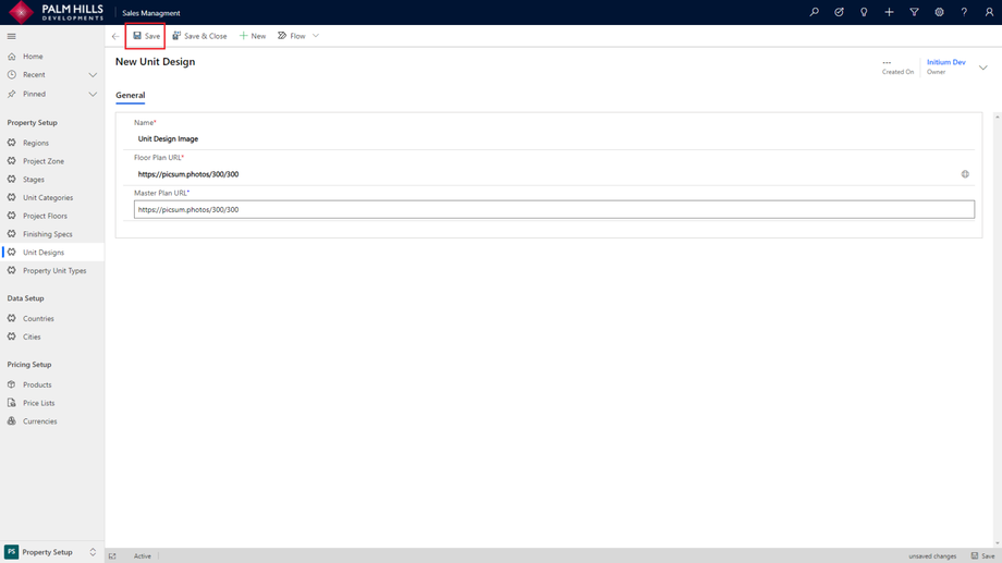 To insert an image URL for the unit design, navigate to the unit design section and click on the 'New' button.